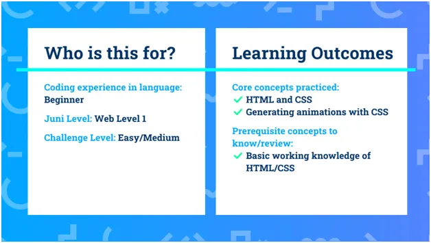 For learning outcomes, you’ll get a lot of practice with writing HTML and CSS, and generating animations with CSS. This project is estimated to take you about 15 minutes, but you should move faster or slower at your own pace!